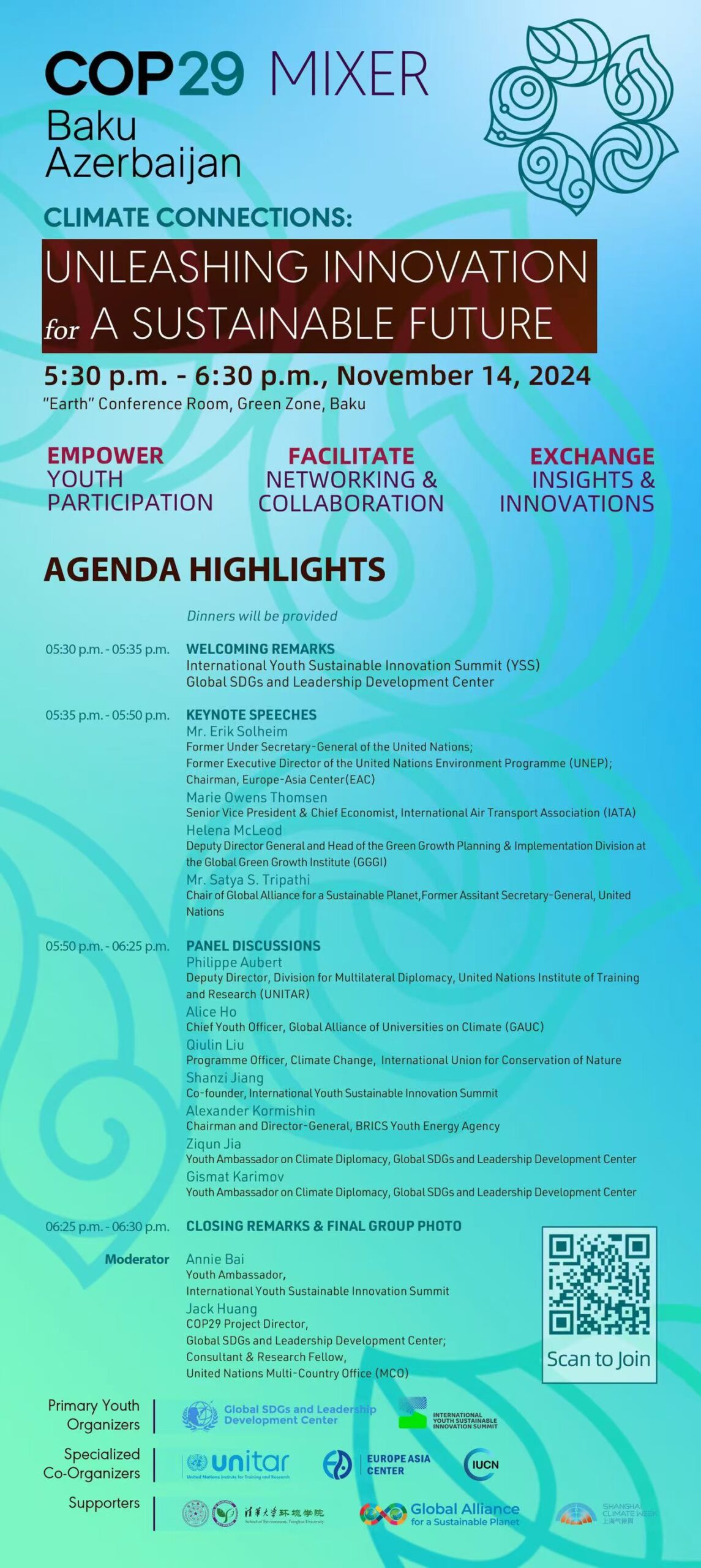 Supported by leading global organizations, the COP29 Mixer offers a unique opportunity to connect, inspire, and drive sustainable change. Scan the QR code to join us!