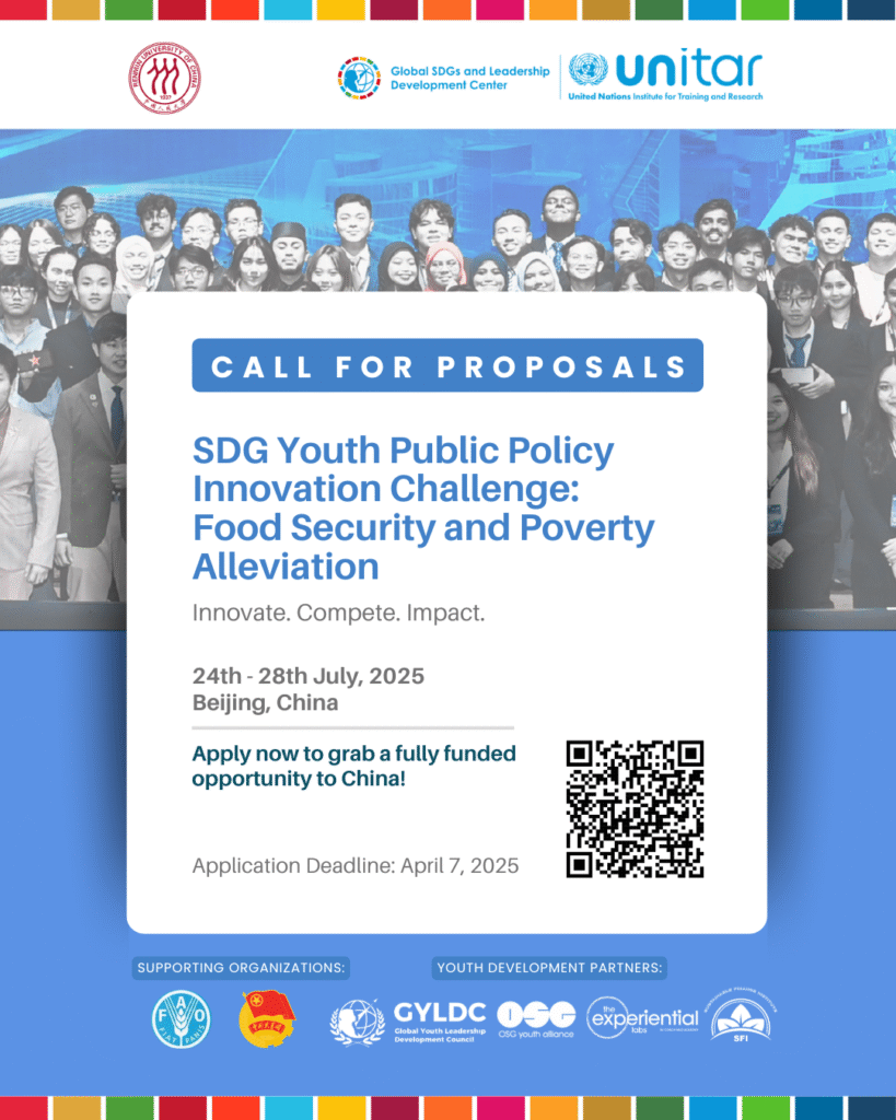 SDG Youth Public Policy Innovation Challenge: Food Security and Poverty Alleviation | Beijing, China| 24-28 July, 2025 OVERVIEW The Global SDGs and Leadership Development Center (UNITAR SDGs Singapore Center), in collaboration with Renmin University of China, proudly presents the “SDG Youth Public Policy Innovation Challenge: Food Security and Poverty Alleviation.” This initiative invites university students […]