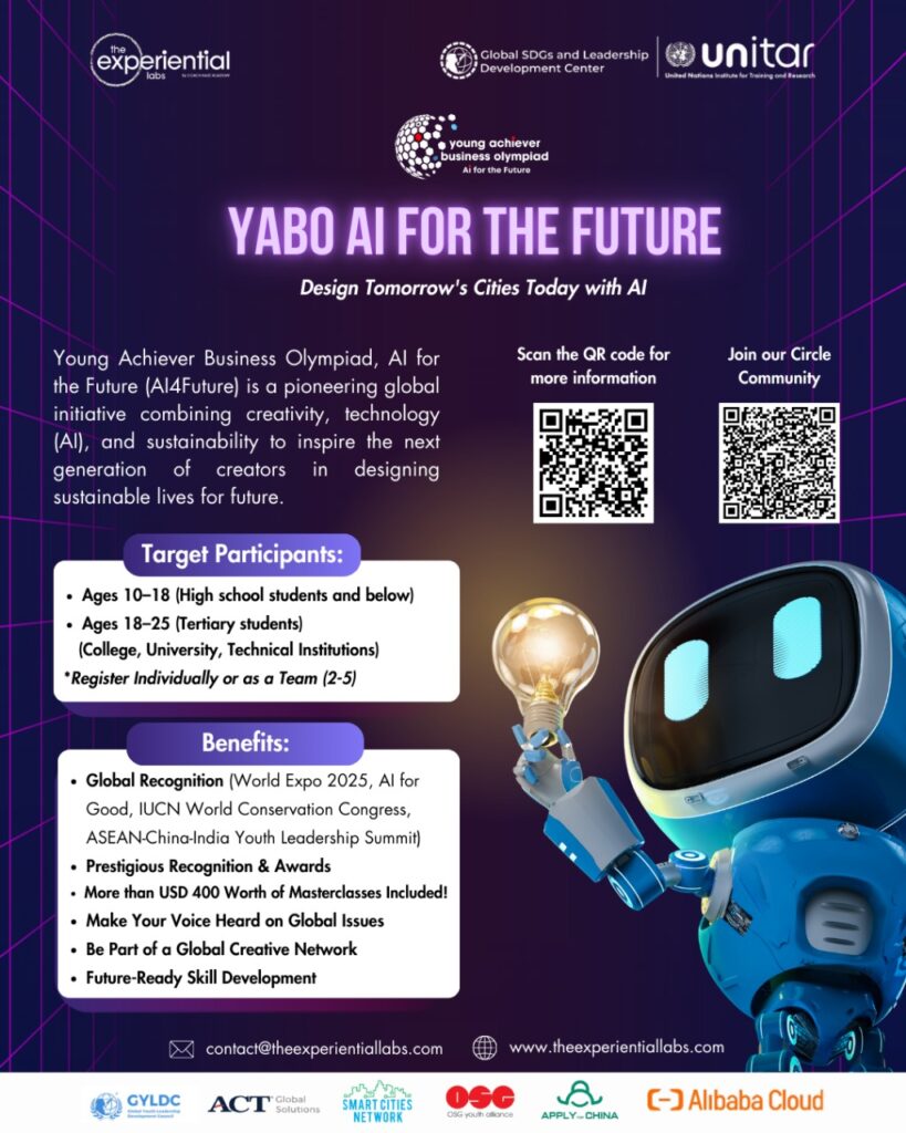 YABO AI FOR THE FUTURE is now officially launched! Overview Organized by The Experiential Labs and Co-Organized by Global SDGs and Leadership Development Center, this global challenge invites youth aged 10–25 to reimagine tomorrow’s cities using AI-generated content (AIGC) blending creativity, technology and sustainability. Why You Should Join AI4F? 🎓 More than USD 400 […]